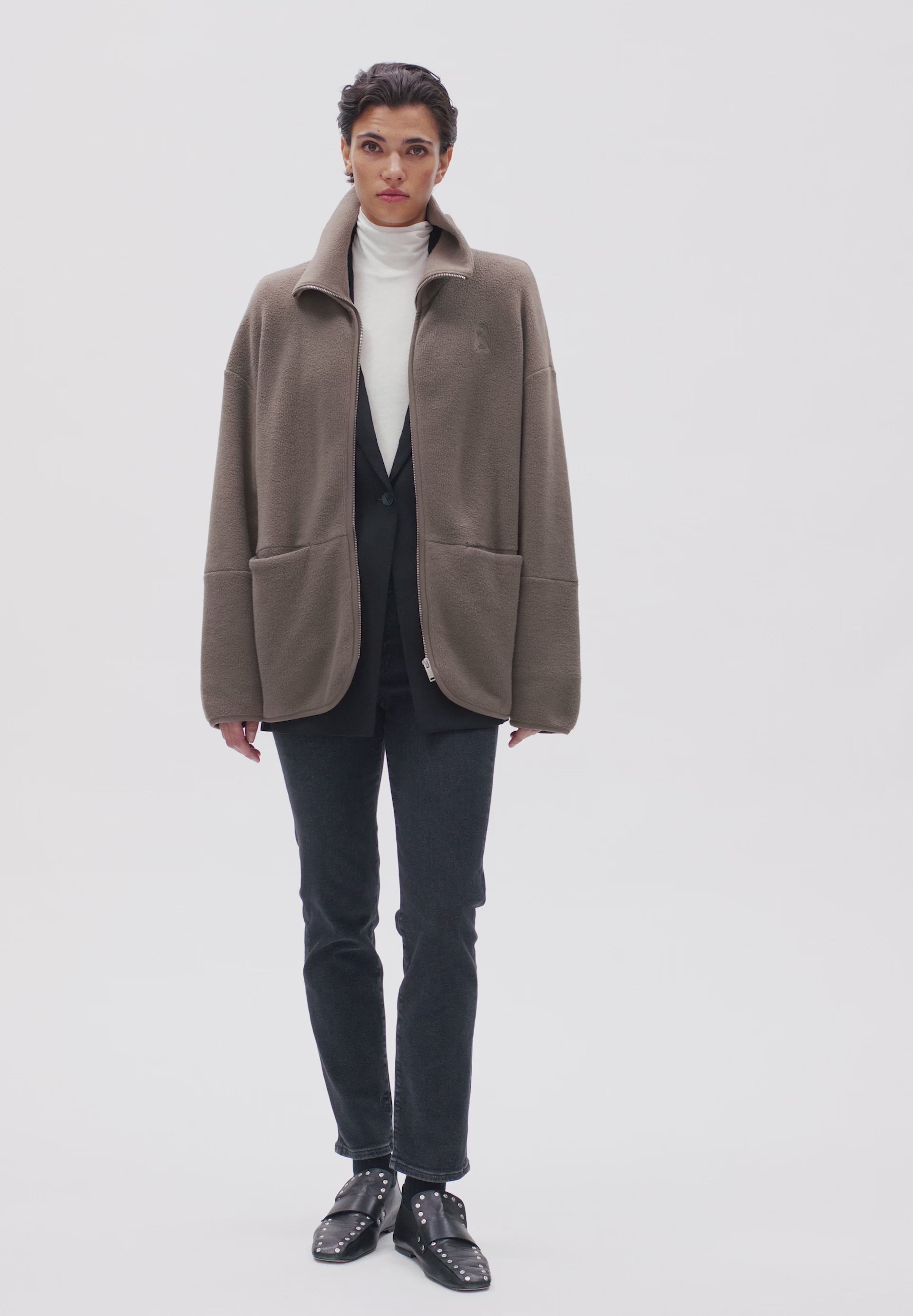 Die ANAAWIL Fleecejacke aus 100% Bio-Baumwolle bietet eine lässige, lockere Passform mit überschnittenen Schultern