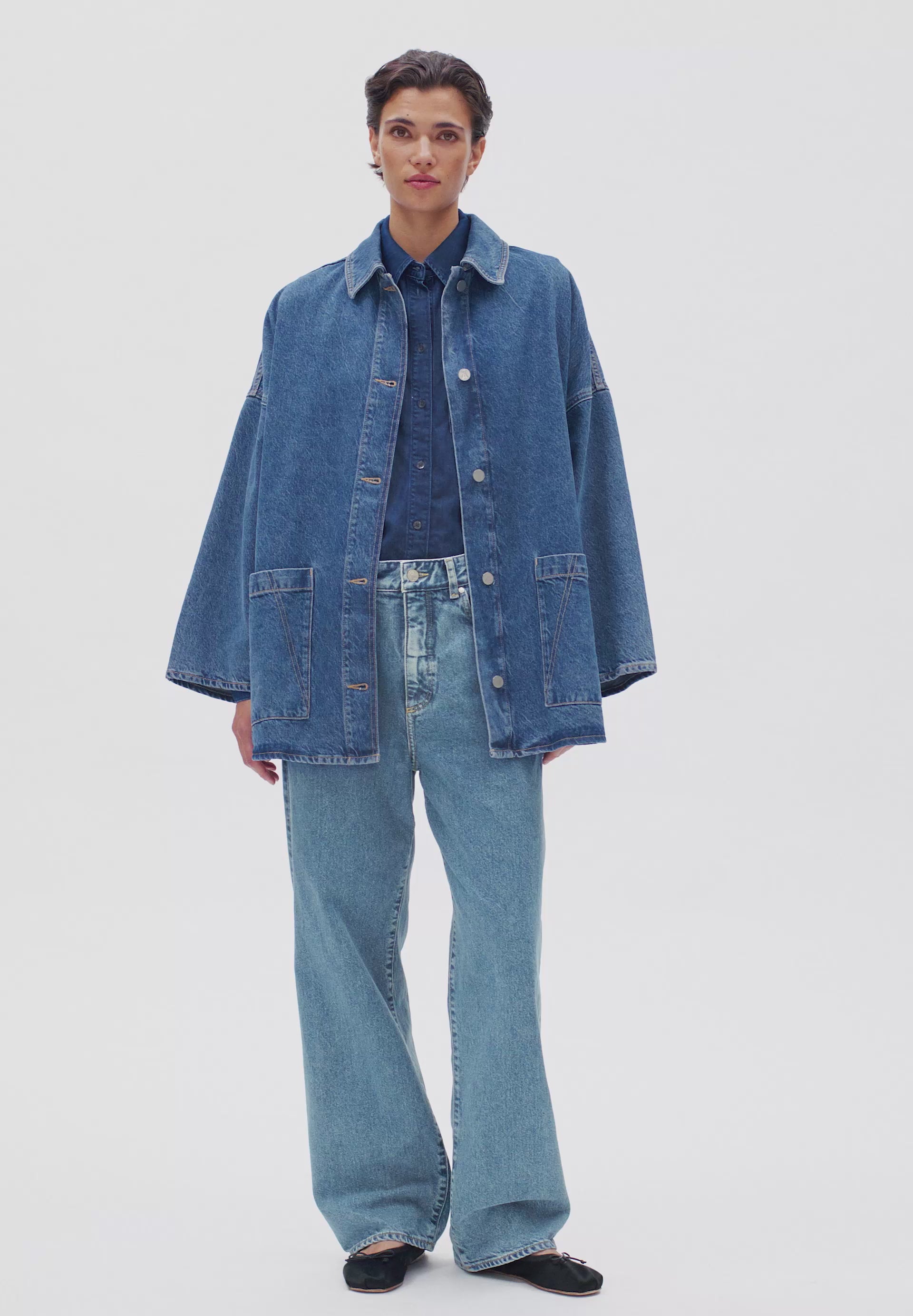 La veste en jean DRAAPY présente une coupe décontractée et ample, un col chemise