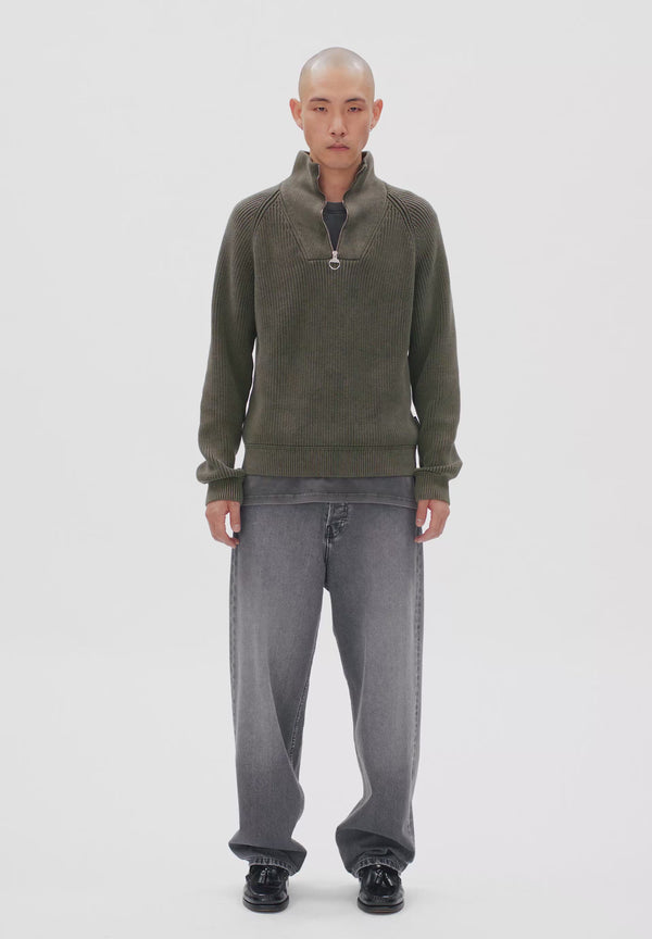 Der KAALVES GMT DYE Strickpullover aus 100% Bio-Baumwolle hat einen geraden Schnitt und einen hohen Kragen mit Reißverschluss. Das Troyer-Design macht ihn zu einem vielseitigen Klassiker und sorgt für bequemen Tragekomfort.